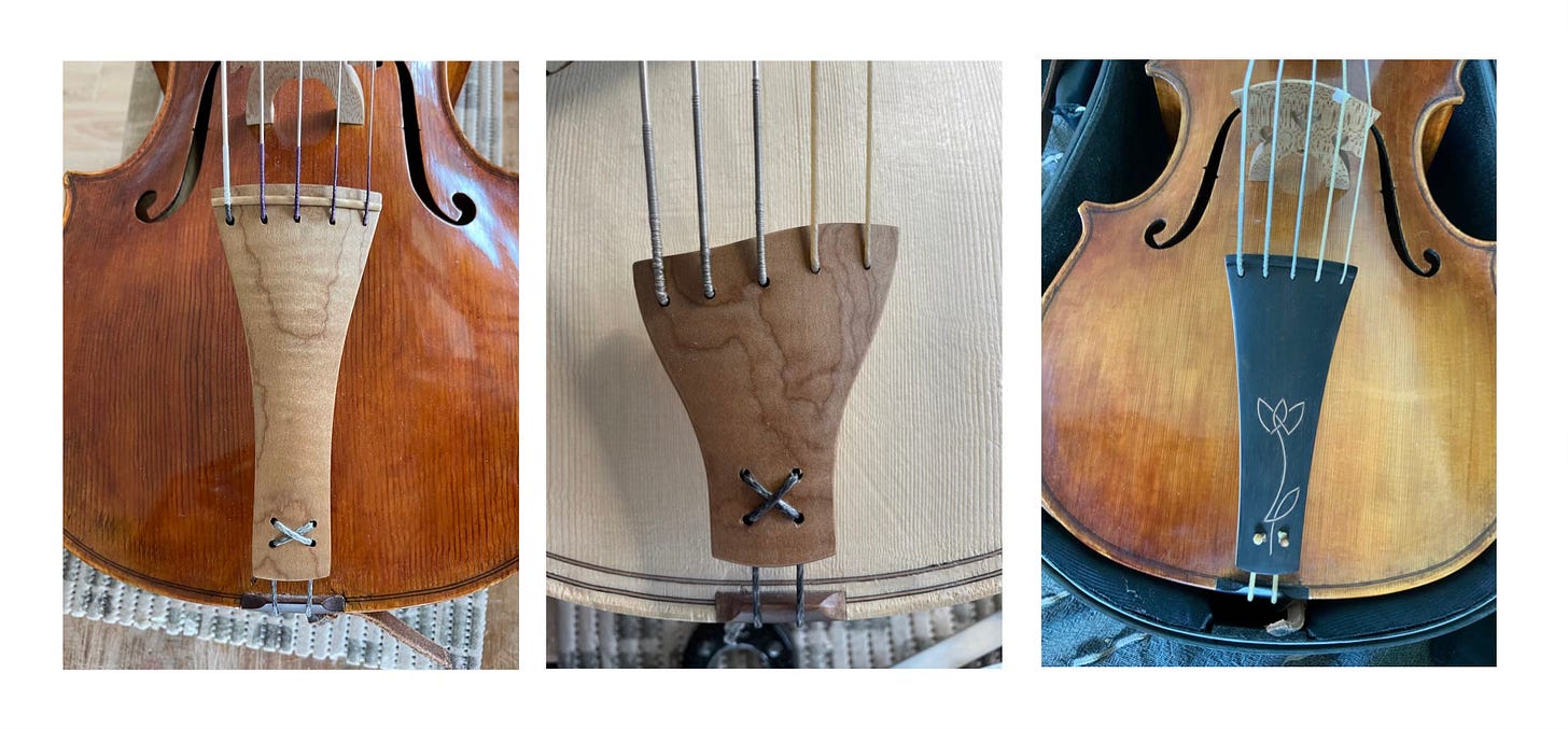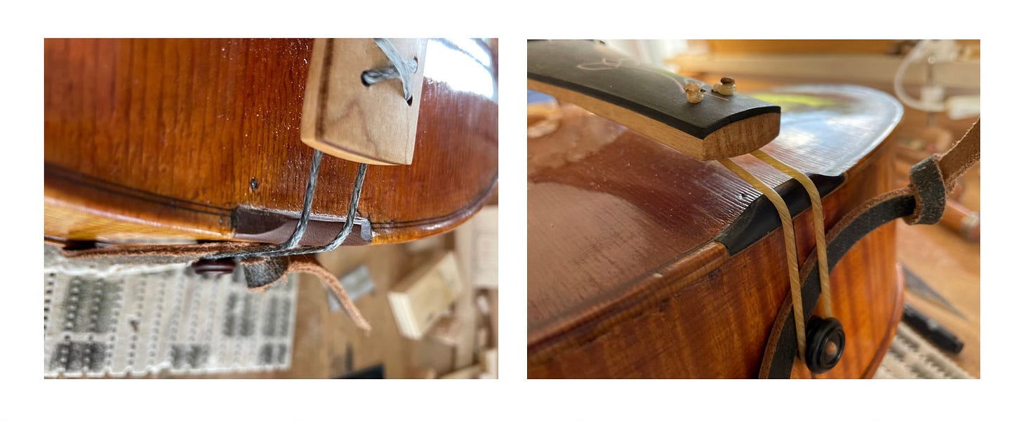 So we tried, and we introduced at Mondomusica, Cremona, a tiny tailpiece on Alessandro’s Violoncello da Spalla. It was made with scrap pieces of veneer glued on a maple core, and with its Dyneema chord, it was nicknamed “lederhosen”, after the traditional short leather trousers used traditionally here.