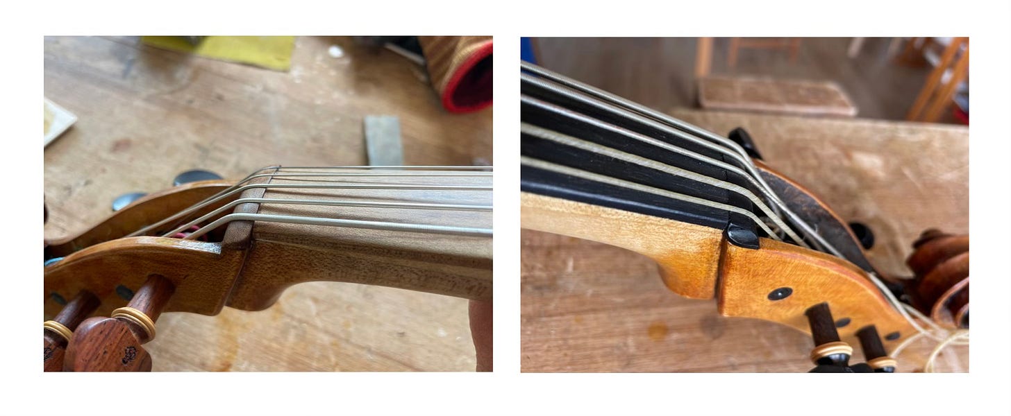 The other one will have a straight modern setup with sonowood spruce fittings and Warchal/Thomastick strings.
