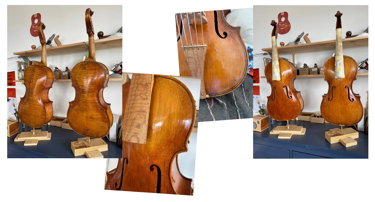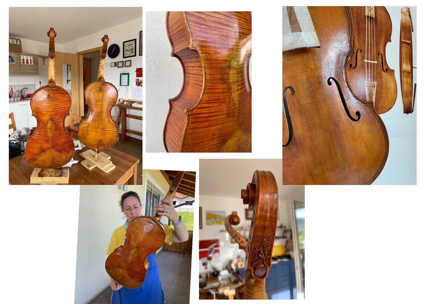 The two characters usually reveal aesthetically as well at the moment of varnish. Last year, the modern one had a single purfling, no special decorations, eye-catching wood, and a brilliant brown-red varnish. The baroque one had less pigment in the varnish, was slightly antiqued, had double purflings, and had my signature carved flower decoration on the back of the pegbox.
