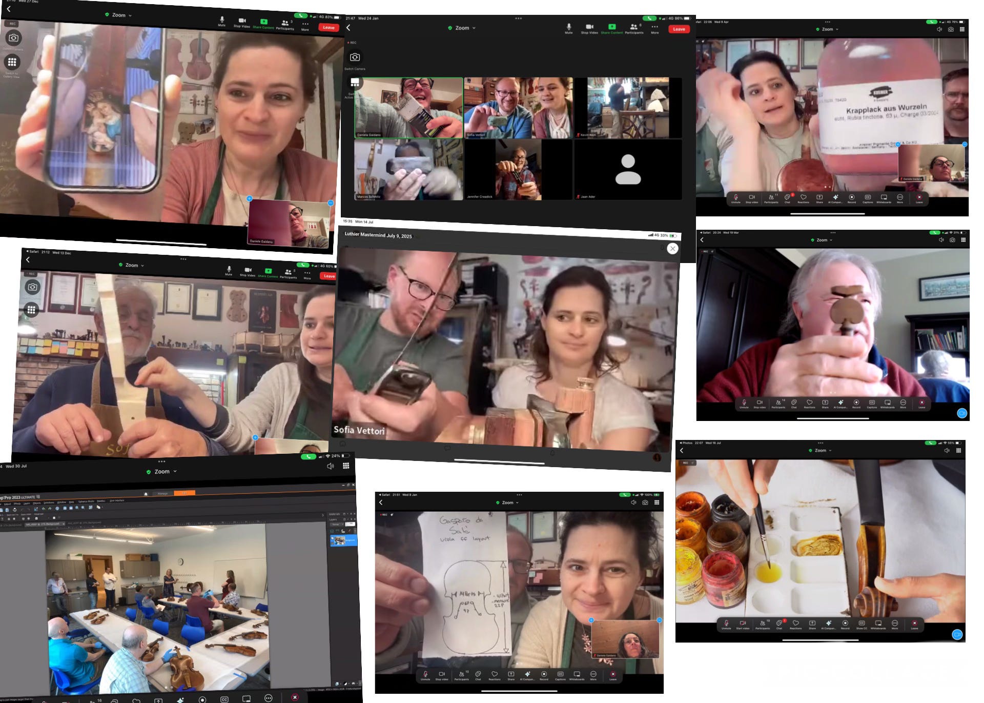 Special Guests: this is an incredible added value: every couple of months, during the Zoom call, special guests talk about specific topics. They are at the top of their field, and often it’s not easy to access their knowledge elsewhere! Until now we had: Ed Mingo from Pirastro speaking about the history of the company and the characteristic of the various sets, Thomas Croen on special DIY tools for setup, Boris Haugh and Kathy Reilly on alternative materials for fingerboards and fittings, Eric Mayer on pegs and tailpiece, Daniel Gillespie on 3D tech in violin making, Iriss Carr on retouching. The next one will be Pierre Flavetta on grounds and varnishes. And sometimes we also have Paolo Vettori, Sofia’s father, happily sharing his lifelong experience!